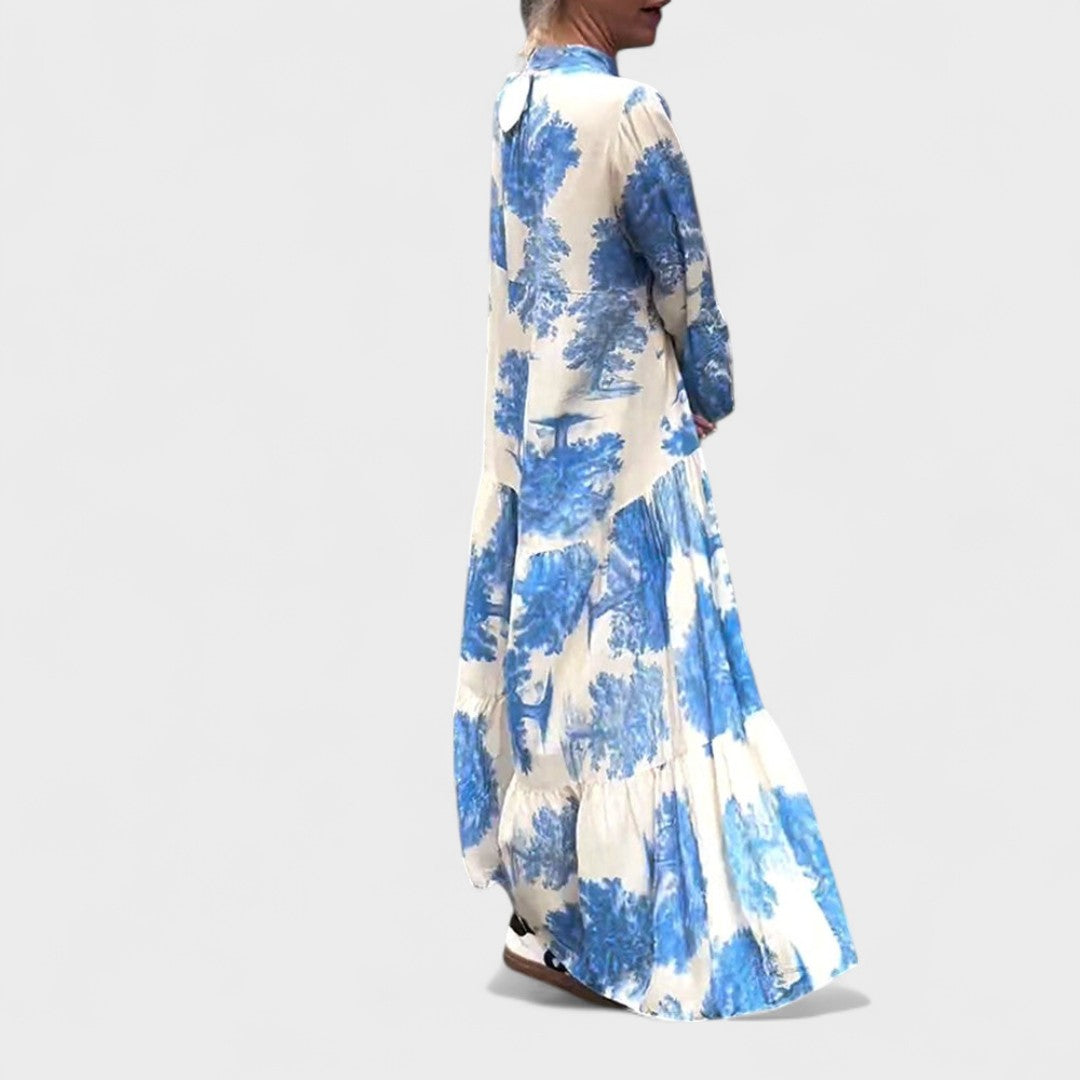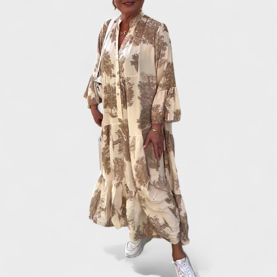 Este vestido maxi combina conforto e elegância com um toque descontraído. O corte solto, aliado aos botões frontais e às mangas largas, oferece um visual leve e sofisticado — perfeito para os dias de verão ou momentos em que o estilo tem de andar lado a lado com a liberdade de movimentos.