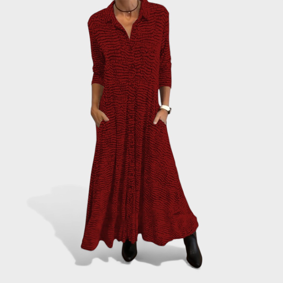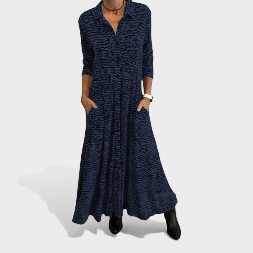 Este vestido comprido combina fluidez, conforto e um estilo naturalmente elegante. O corte solto adapta-se ao corpo de forma harmoniosa, enquanto o decote com colarinho e a abertura discreta conferem um toque moderno e descontraído.