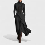 Este vestido comprido foi criado para mulheres que querem sentir-se confortáveis sem abdicar do estilo. A saia assimétrica em camadas cai suavemente em torno do corpo, enquanto a gola subida e as mangas compridas acrescentam um toque sofisticado e moderno.