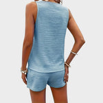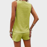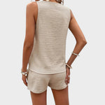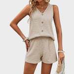 Este conjunto de verão é a escolha ideal para quem procura estilo e conforto num só look. Com um corte descontraído, tecido fresco e detalhes simples como os botões frontais, adapta-se perfeitamente a dias descontraídos, passeios à beira-mar ou tardes de descanso com charme.
