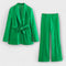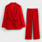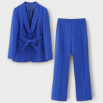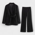 Este conjunto foi desenhado para mulheres que querem destacar-se com confiança e sofisticação. O blazer cintado valoriza a silhueta, enquanto as calças de corte elegante proporcionam um visual moderno e equilibrado.
