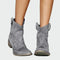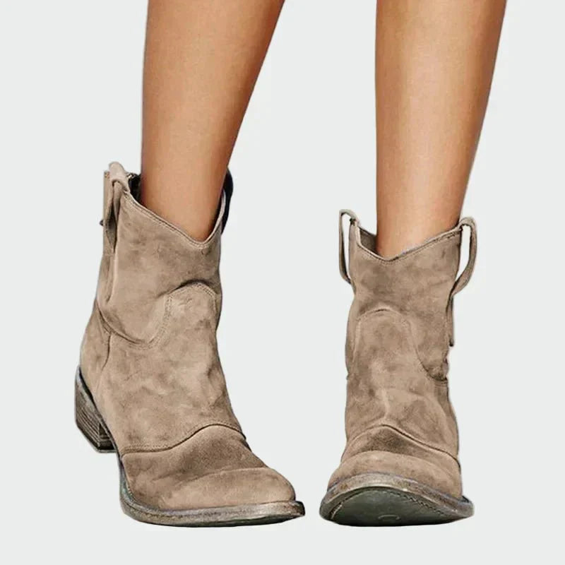 Botas de cowboy vintage para mulheres em tom de castanho terroso, desenhadas com um salto baixo e bico fino para um look western autêntico. A textura em camurça confere elegância e estilo, enquanto as práticas alças laterais tornam o calçar fácil e confortável. Um par que combina conforto com um caráter único, ideal para looks casuais e mais boho.