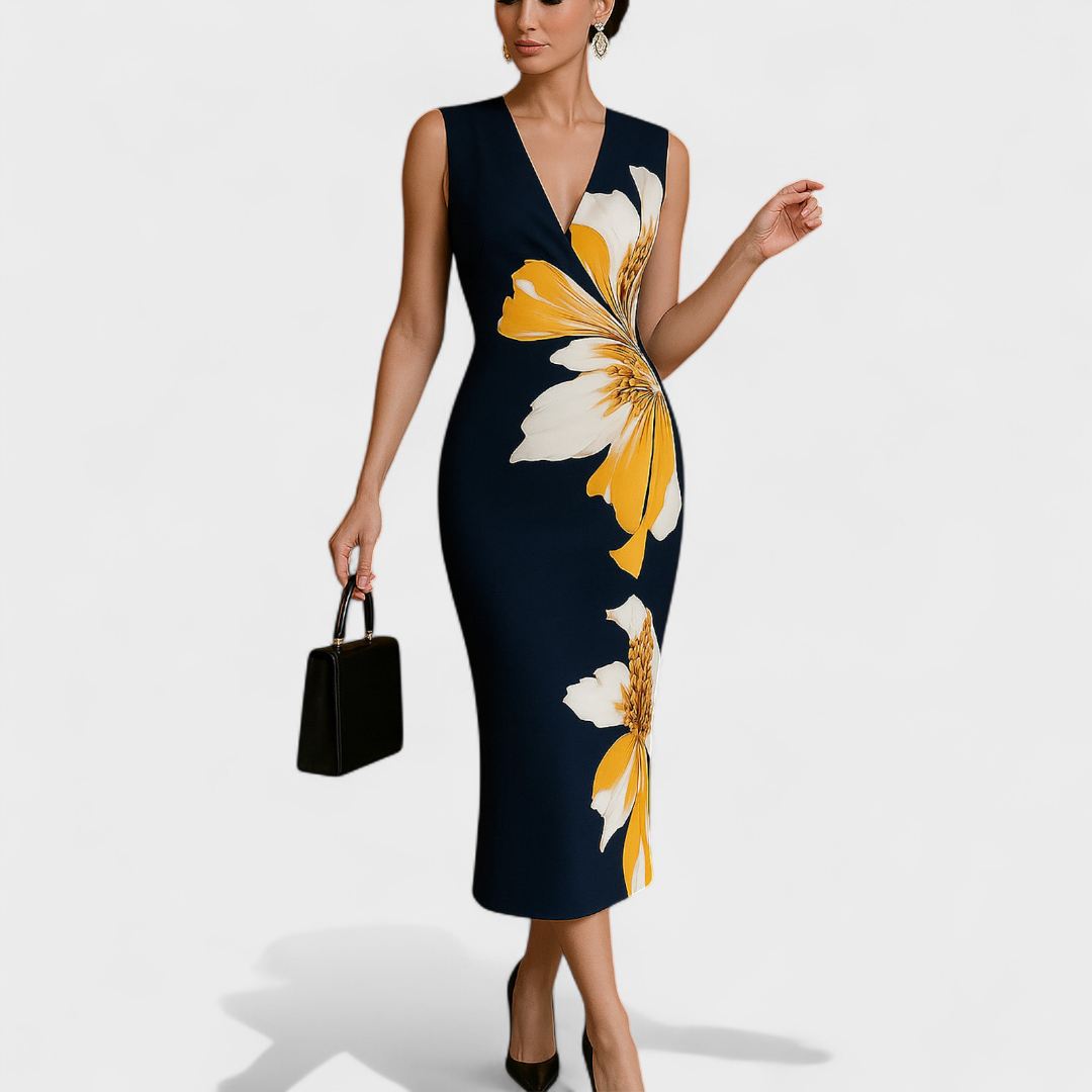 Este vestido midi sem mangas é a escolha perfeita para mulheres que desejam destacar-se com sofisticação e feminilidade. O estampado floral em contraste realça as curvas de forma delicada e harmoniosa, enquanto o corte ajustado garante um visual moderno e irresistível.