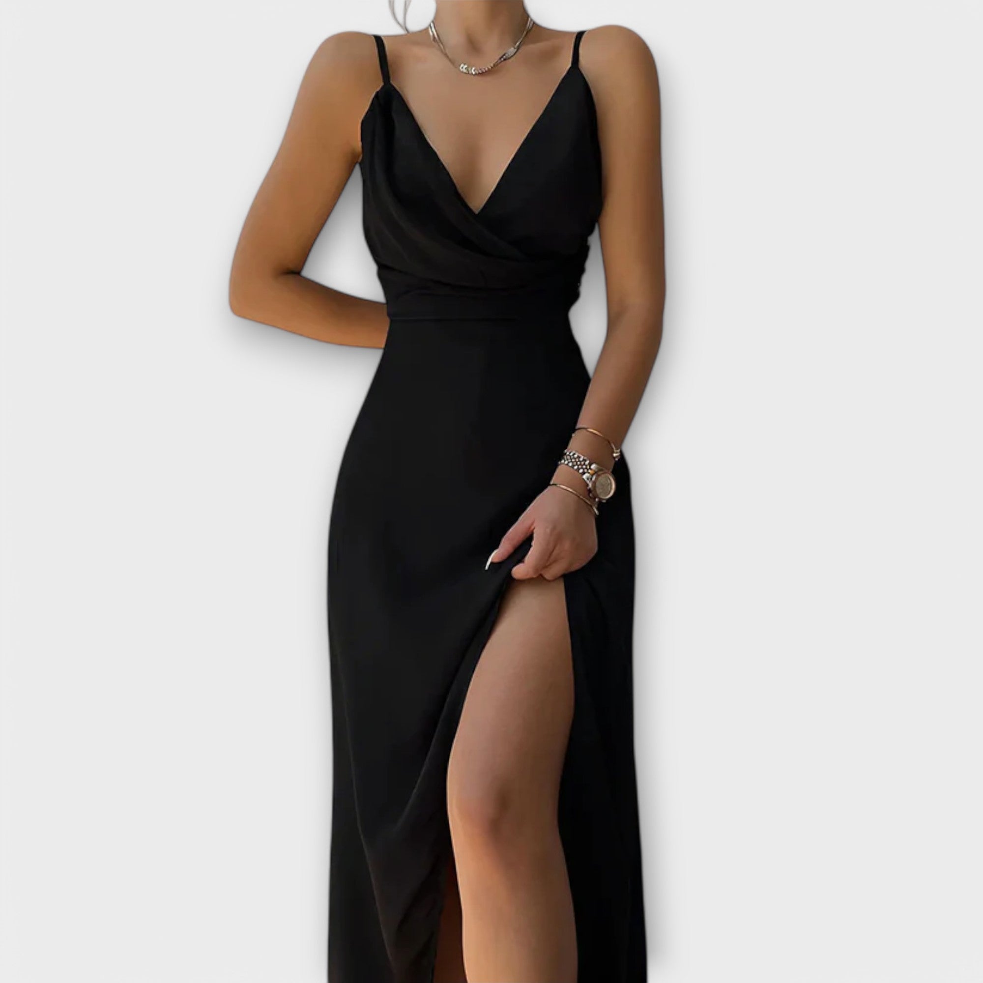 Este vestido com decote em V é uma escolha ideal para quem deseja um visual refinado e feminino, adequado para eventos que pedem um toque de sofisticação.