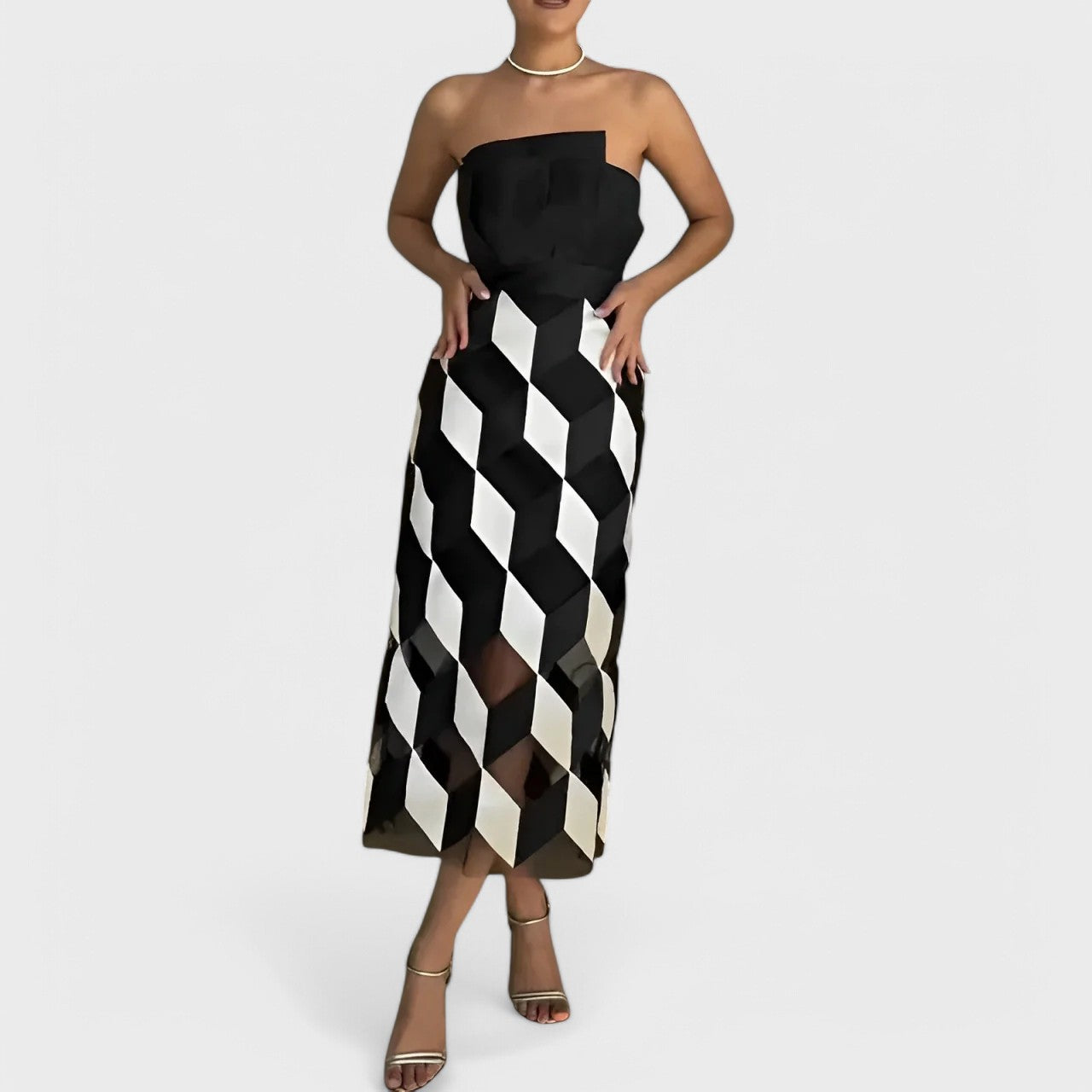 Sofisticação e modernidade encontram-se neste Vestido Midi Geométrico Elegance. Com um design cai-cai, valoriza a silhueta com elegância, enquanto a estampa em preto e branco com padrões geométricos cria um efeito visual impactante e requintado.