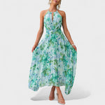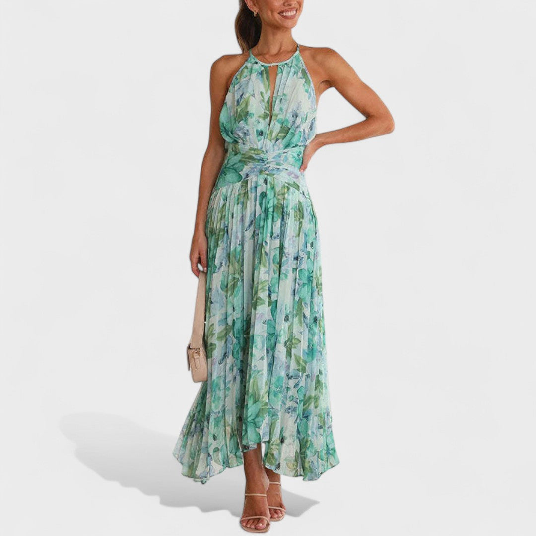 Este vestido foi feito para quem quer brilhar com naturalidade. Com um corte fluido e delicado, o seu design realça a cintura e valoriza os ombros com um decote halter sofisticado.